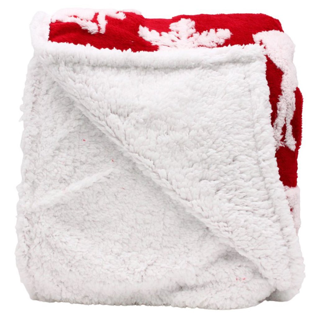 A takaró piros alapon, téli hópehely motívumokkal díszített, jacquard mintázatú. A másik oldala fehér báránybőr.