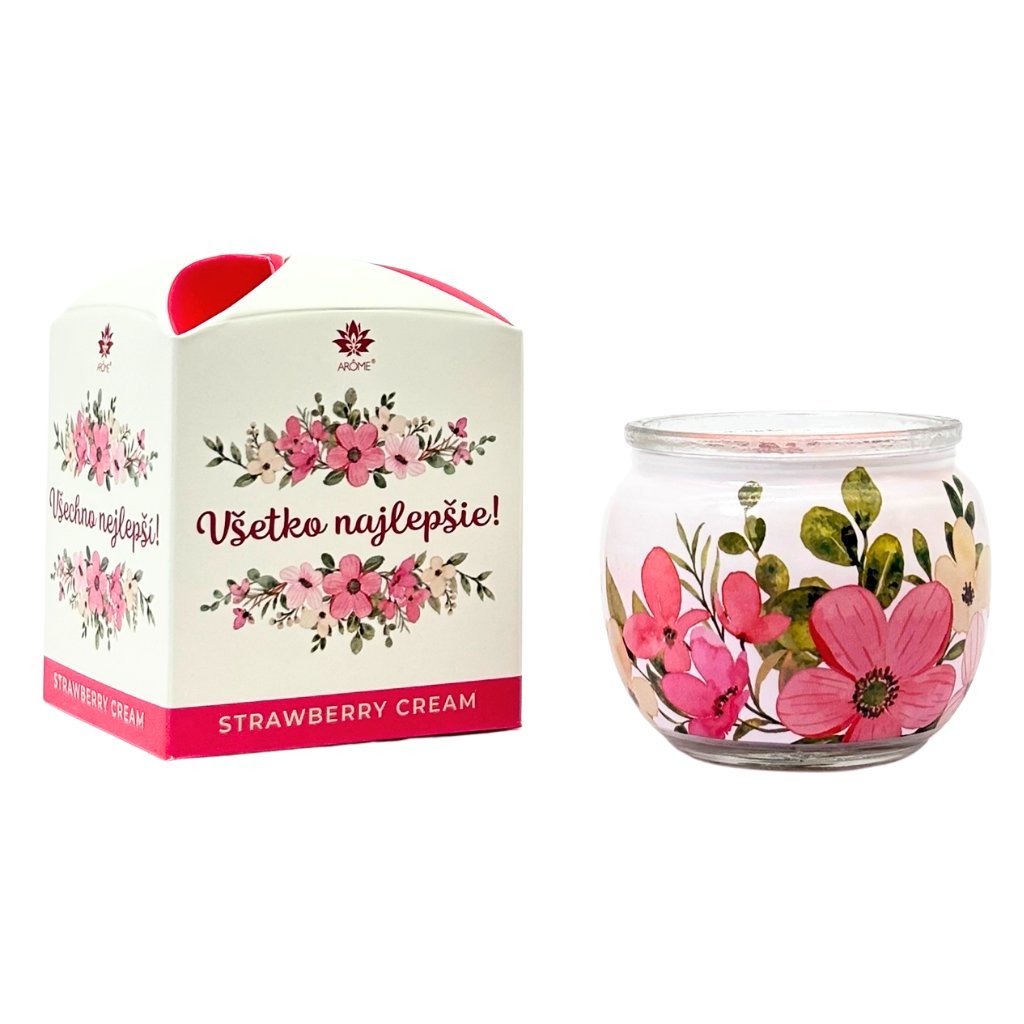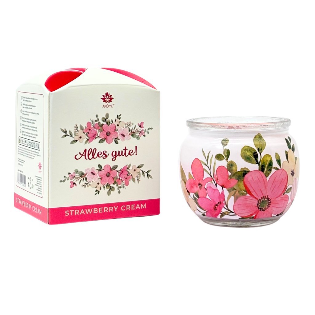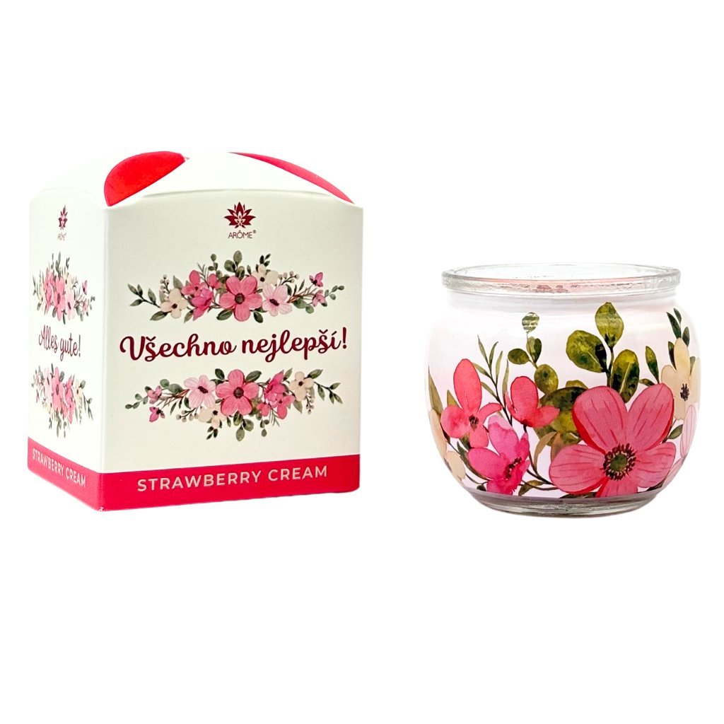 Az illatos gyertya nagyszerű ötlet egy kis ajándékhoz, például születésnapra. Az illatos gyertya luxus, elegáns csomagolásban, ajándék virágdobozban érkezik, „Minden jót!” felirattal.Egy kellemes eperkrém illat és egy színben harmonizáló dekoratív design.Egy ilyen figyelmességet mindig szívesen fogadnak.