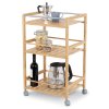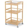 Bambusz kocsi három polccal, szürke műanyag kerekekkel és fém fogantyúkkal. A funkcionális kialakítás és a bambusz természetes színe sokoldalúan illeszkedik a ház bármely helyiségébe: a fürdőszobába, a konyhába, a nappaliba... tárolhatja benne a dolgait, és kéznél is tarthatja őket. A 4 forgó keréknek köszönhetően a kocsi nagyon praktikus és könnyen mozgatható. Ez a kocsi maximum 15 kg-ot bír el.
