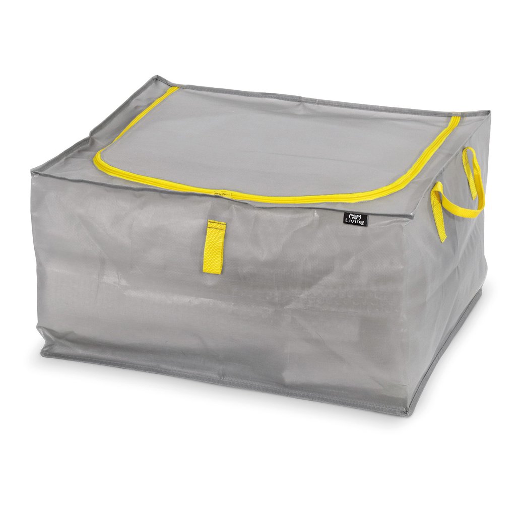 A csomagolás erős polipropilénből készült, vízálló és mosható. A felső cipzáros záródás biztosítja, hogy a tartalom biztonságban legyen, szennyeződéstől, portól és nedvességtől mentesen, a cipzár pedig könnyű hozzáférést biztosít. A sárga fogantyú és hurok segítségével kényelmesen kihúzhatja a csomagolást a szekrényből vagy a polcról, vagy áthelyezheti azt.