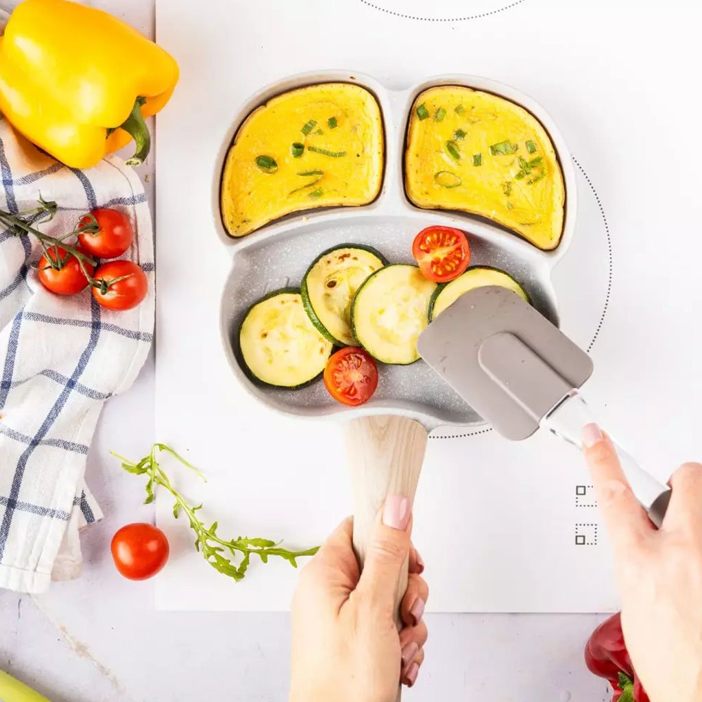 A Klausberg serpenyő praktikus elrendezésű főzőfelületet kínál – a két kerek forma ideális tükörtojás, kisebb palacsinták vagy mini amerikai palacsinták készítéséhez. A harmadik, hosszúkás rész a szalonna, zöldségek, kolbászok, hamburgerek vagy egyéb reggeli kiegészítők sütésére szolgál. A különálló zónák lehetővé teszik, hogy egyszerre több különböző alapanyagot készítsen el, anélkül, hogy az ízek és illatok összekeverednének.