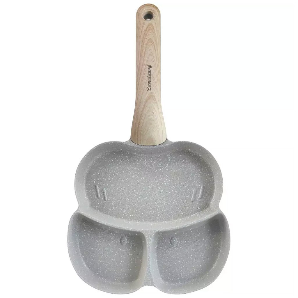 A 19 cm széles Klausberg serpenyő ideális segítőtárs azok számára, akik gyorsan, átláthatóan és ízkeverés nélkül szeretnének teljes reggelit készíteni. A három praktikus rész lehetővé teszi a tojás, palacsinta vagy kolbász egyidejű sütését. A tapadásmentes felület biztosítja, hogy az étel ne ragadjon le, és a mosogatás pillanatok kérdése. A serpenyő minden típusú tűzhelyhez alkalmas, beleértve az indukciósat is.
