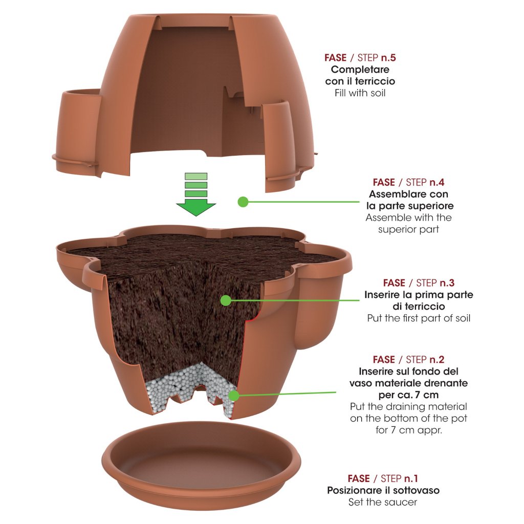 Az Oasi virágtartó, amelyet klasszikus toszkán edény ihletett méretei miatt, szilárd, elegáns és nagyon stabil. Nagy központi nyílással, 6 oldalzsebbel és speciális aljzattal rendelkezik, amely megkönnyíti a gyökerek oxigénellátását.