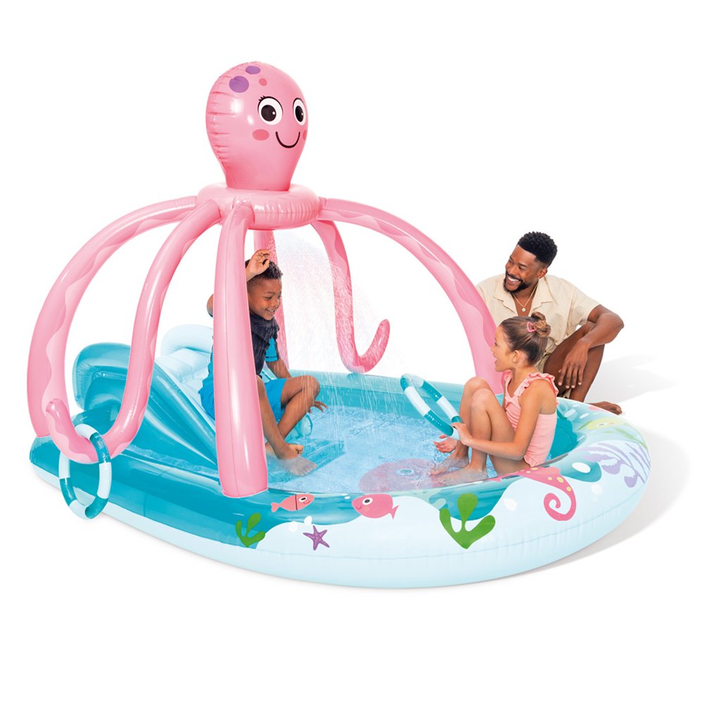 Az INTEX polip játékközpont egyszórakoztató medencés játszóközpont csúszdával, vízi zuhannyal (kerti tömlő csatlakoztatás), gyermekpancsolóval és egyéb kiegészítőkkel.