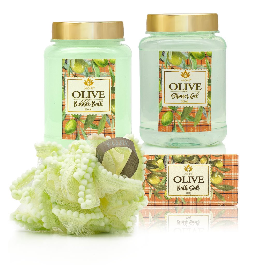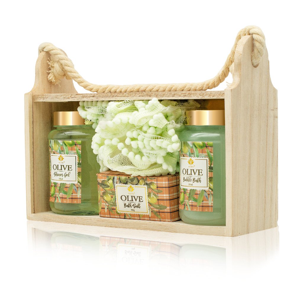 Az olíva illatú készlet fa dobozba és celofánba van csomagolva. Közvetlenül ajándékozásra kész.