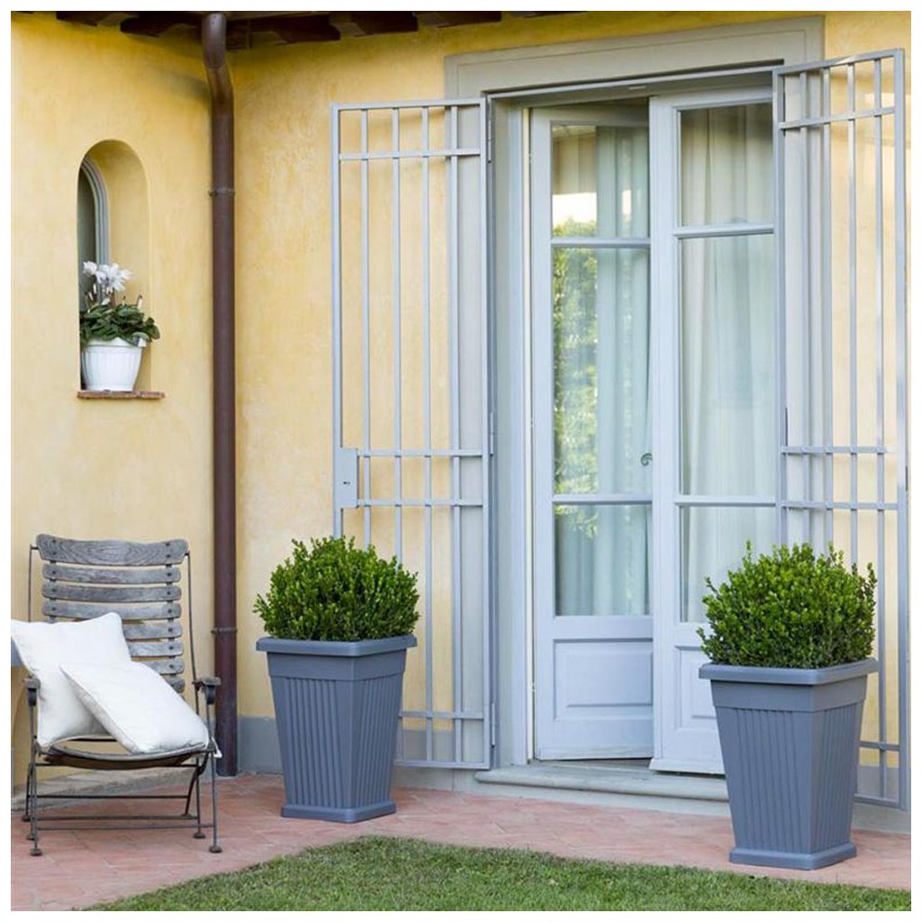 Dekoratív, magas, nagy térfogatú virágcserép alátéttel, elegáns olasz dizájnnal, a gyártótól. BAMA. Kifejező dekorációs elem lesz a teraszon, az ajtóknál vagy a kertben. Ideális kültéri használatra.
