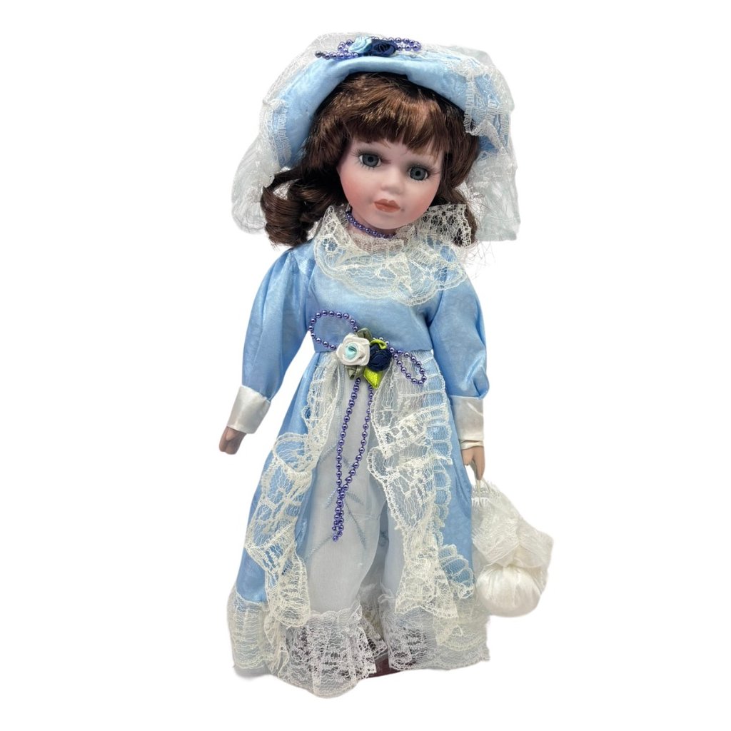 A csodálatos porcelánbabát tökéletesen kidolgozott, számos részlettel, köztük kézitáskával, korallokkal és fehér csipkével díszített kék ruhába öltöztették. A barna, hosszabb, loknikba göndörített haj a kalapja alól kandikál ki.