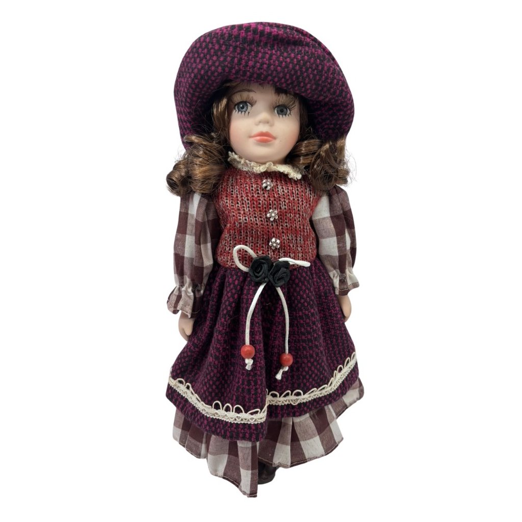A dekoratív porcelán baba tökéletesen kidolgozott, kockás ruhába van öltöztetve, számos részlettel. A hosszabb, barna, loknikba göndörített haj kibújik a kalap alól.