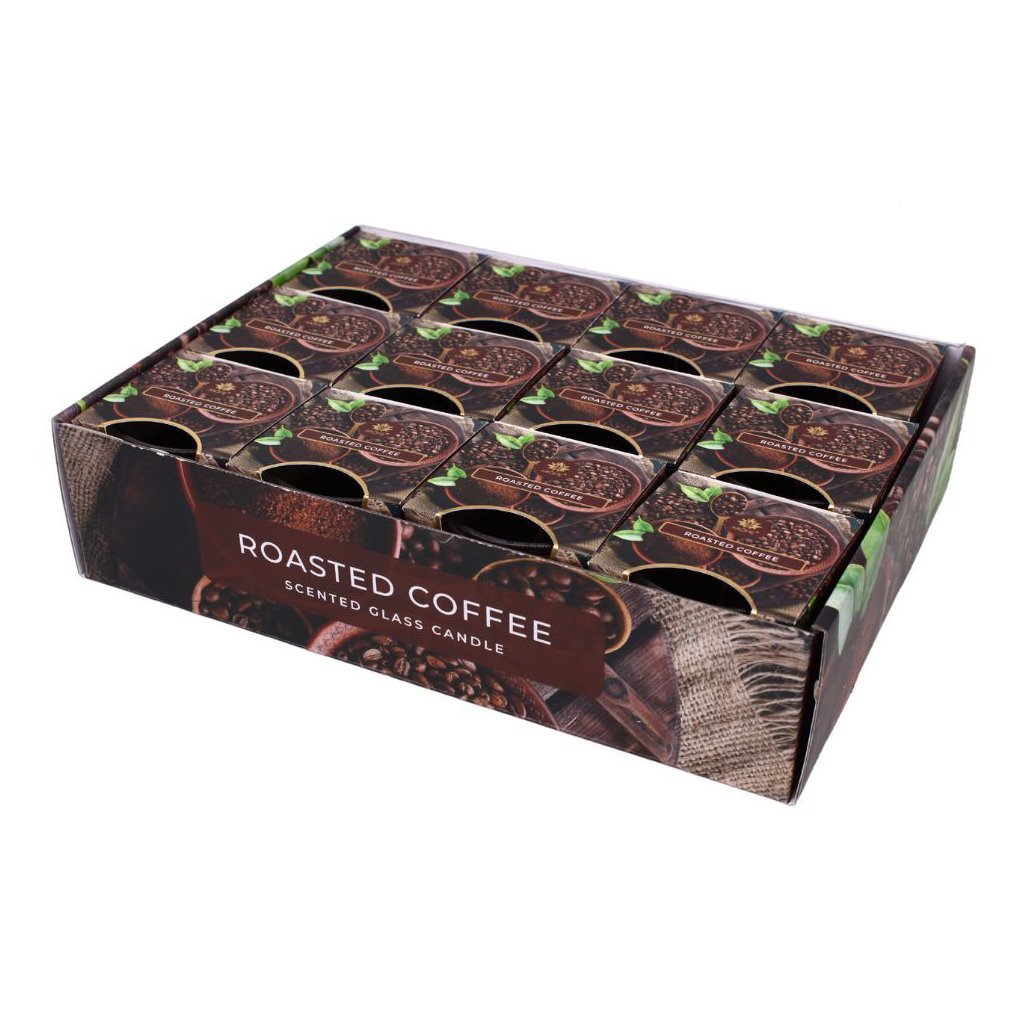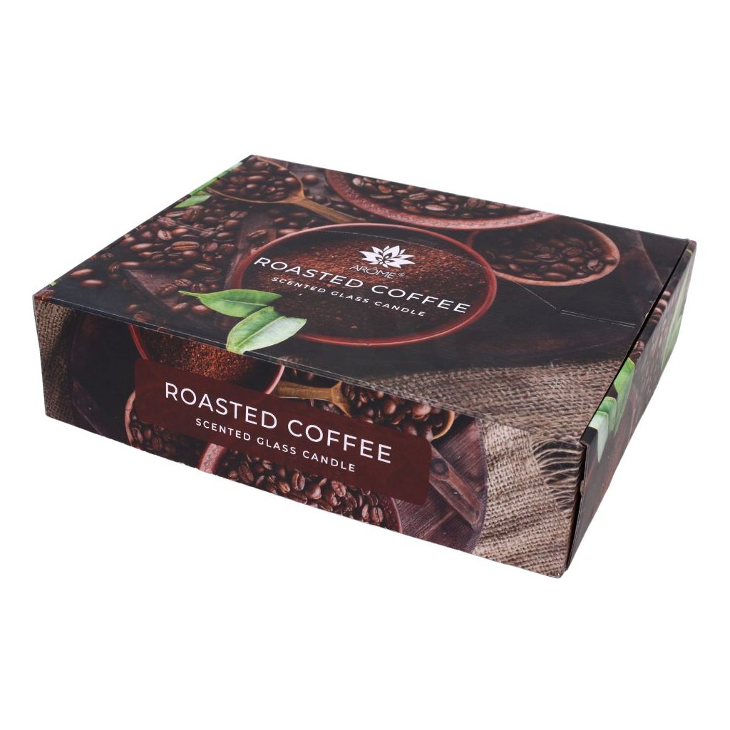 Színes papírdobozba csomagolva. A Roasted Coffee illatgyertya nagyszerű ajándék lehet.