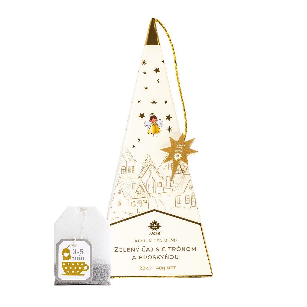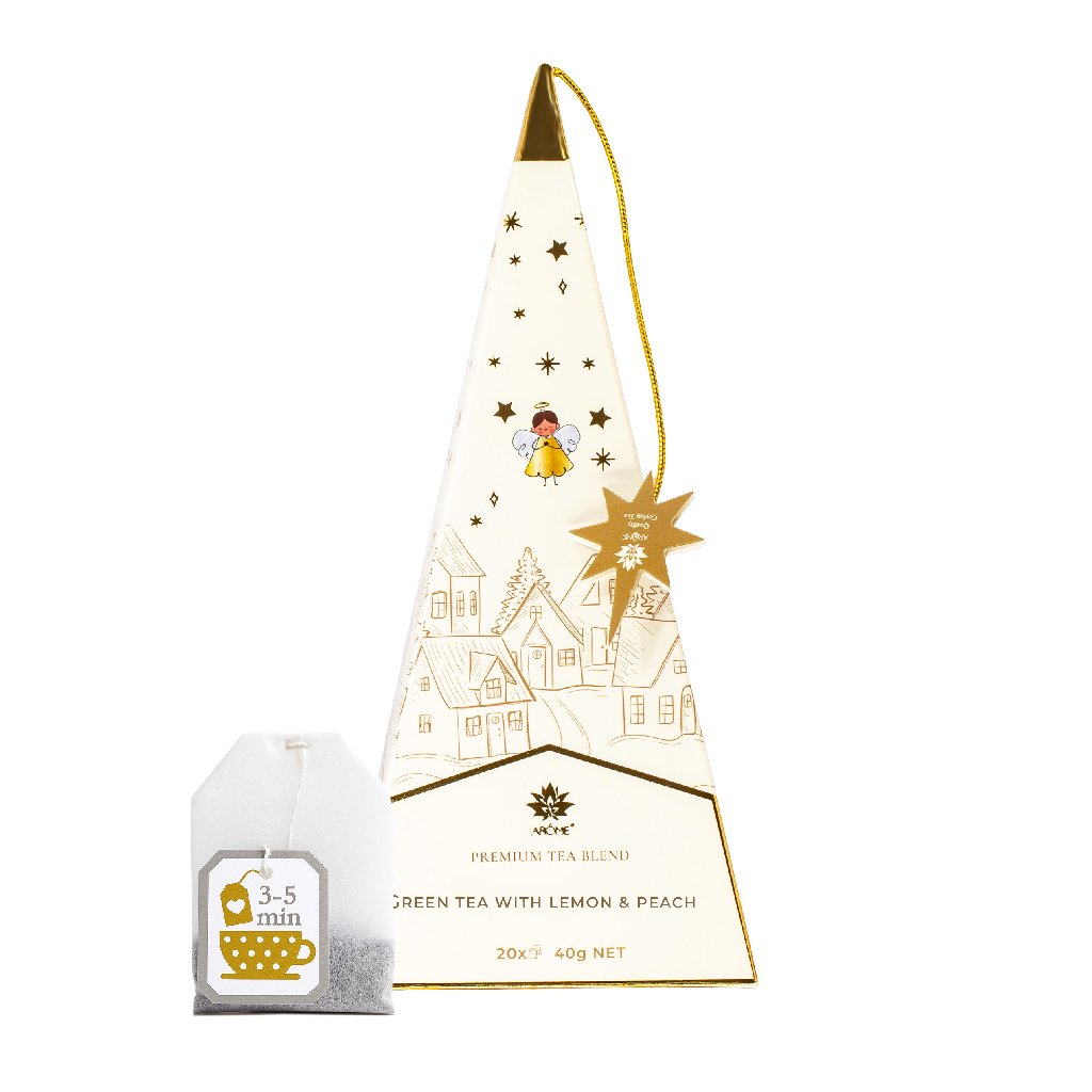 20 filteres teazacskó finom, citrommal és barackkal ízesített zöld teával töltve, gyönyörű, dizájnos, karácsonyi angyalmintás piramisba csomagolva.