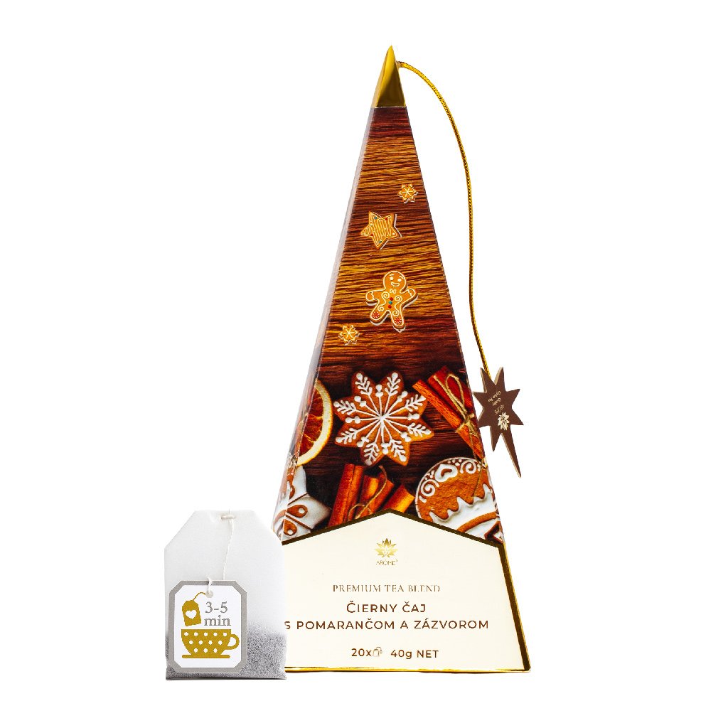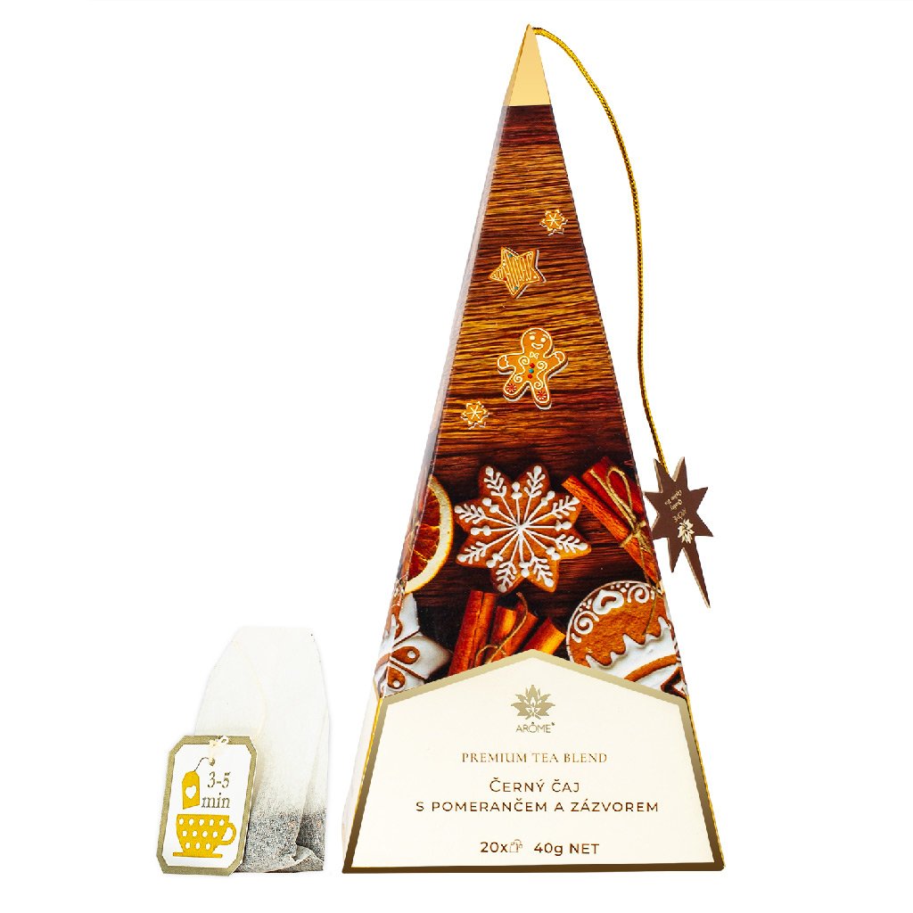 20 teafilter kiváló, narancssal és gyömbérrel ízesített fekete teával töltve, gyönyörű, dizájnos, karácsonyi motívumú, mézeskaláccsal díszített piramisba csomagolva.