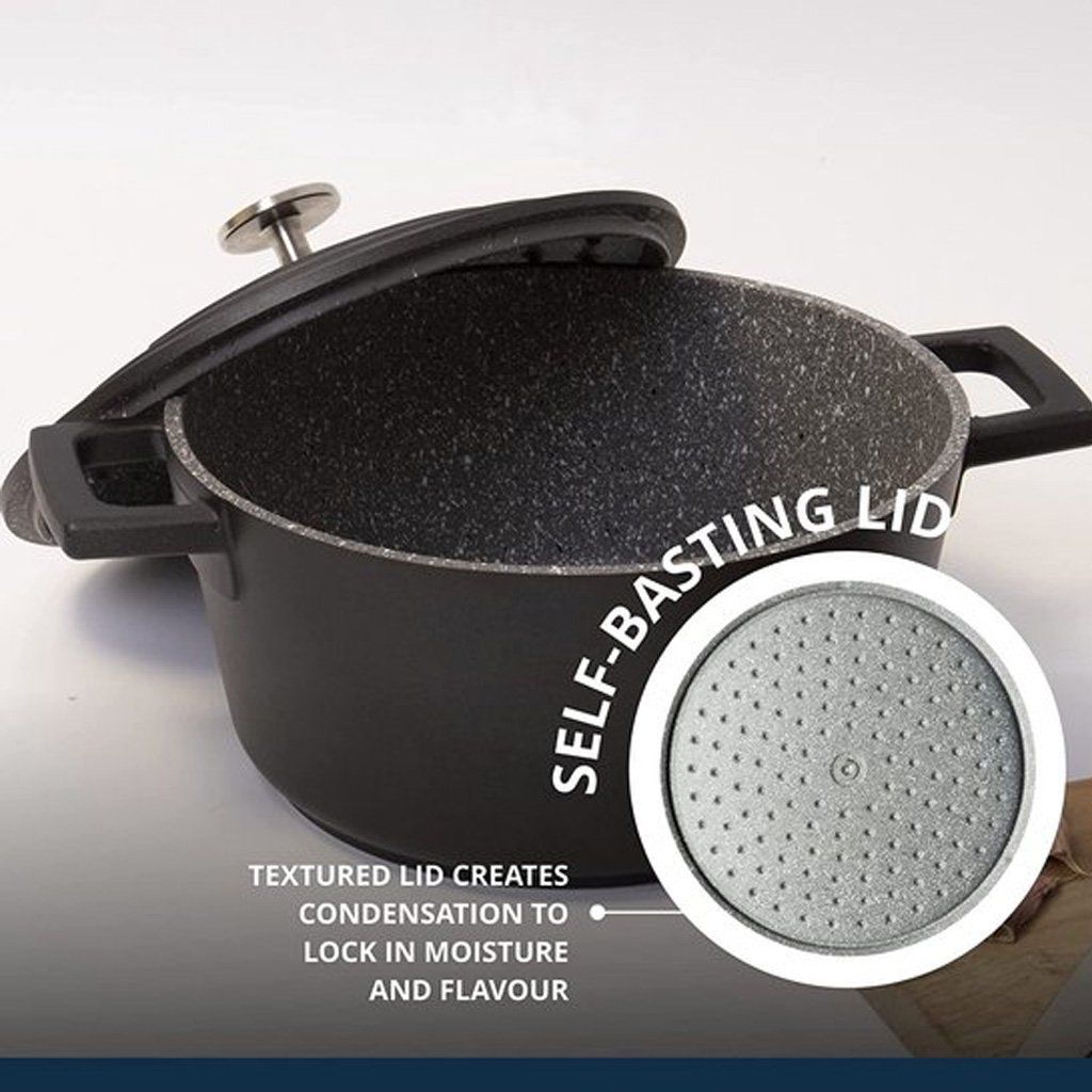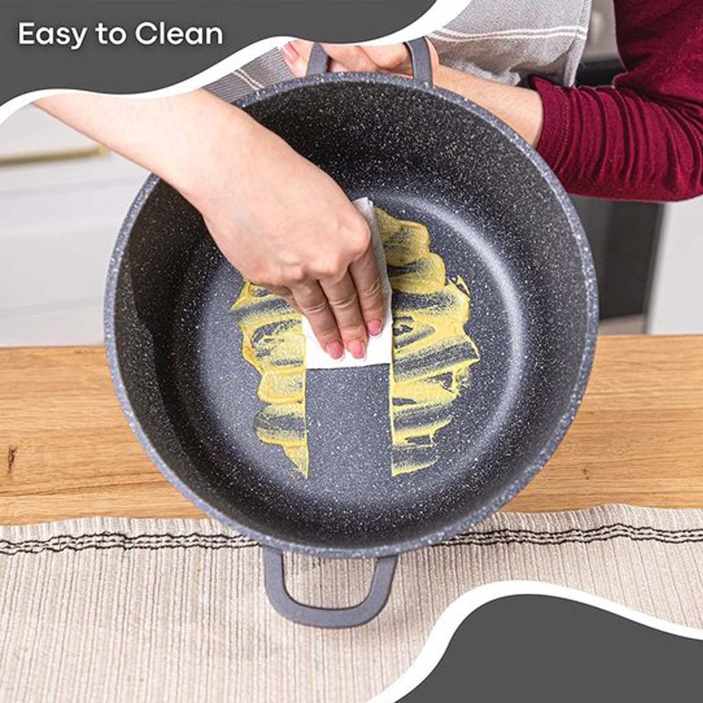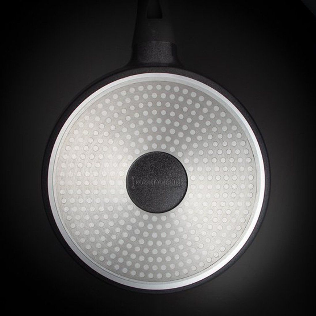 Az edénykészlet nyomás alatt öntött alumíniumból készült. Az edények és serpenyők belső része antibakteriális, tapadásmentes márvány bevonattal van ellátva, amely lehetővé teszi az egészséges főzést minimális mennyiségű olajjal. A megerősített alj lehetővé teszi az egyenletes hőelosztást, és a kiváló hővezetésnek köszönhetően a hő gyorsabban oszlik el. Aindukciós főzőlapokhoz alkalmas.