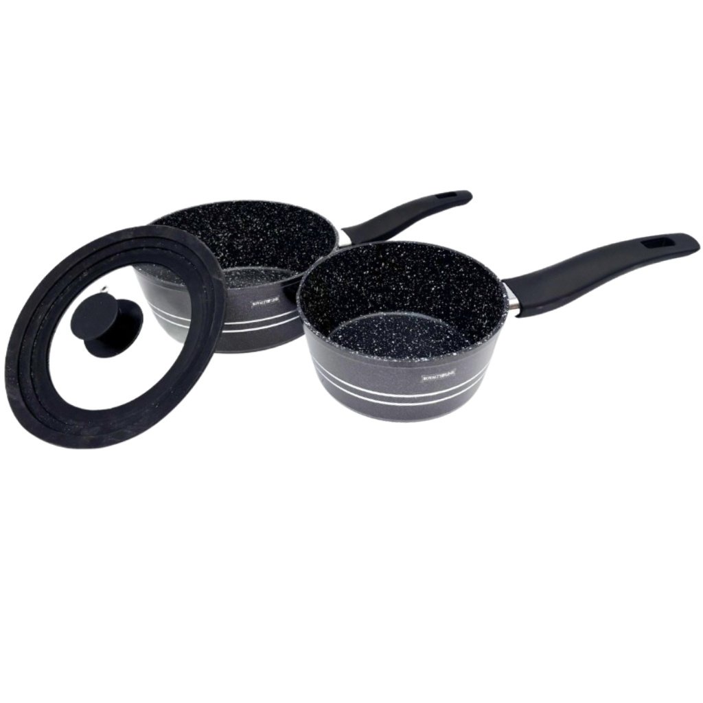 A serpenyőkészlet kovácsolt alumíniumból készült. A serpenyők belső része antibakteriális, tapadásmentes márvány bevonattal van ellátva, amely lehetővé teszi az egészséges főzést minimális mennyiségű olajjal. A megerősített alj kiválóan vezeti a hőt. A serpenyők minden típusú tűzhelyhez alkalmasak, beleértve az indukciósat is.