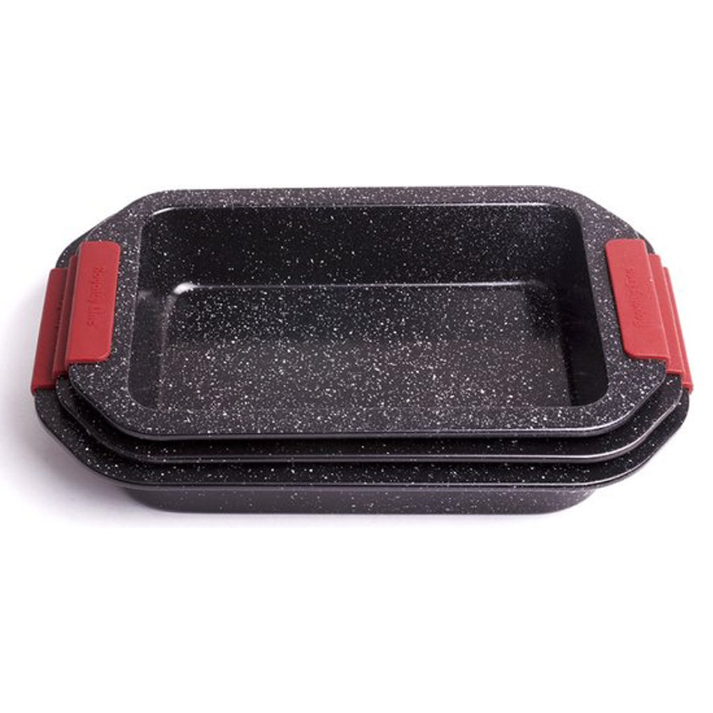 A minőségi, tartós sütőformák minden konyha alapvető kellékei közé tartoznak. Az egészséges sütéshez minimális zsiradékkal kínálunk Önnek egy 3 darabos Royalty sütőforma készletet antibakteriális, tapadásmentes márvány bevonattal. A fogantyúk szilikon markolattal és speciális Soft touch felülettel rendelkeznek a kellemes, égetés nélküli fogás érdekében. A készlet három méretű sütőformát tartalmaz.