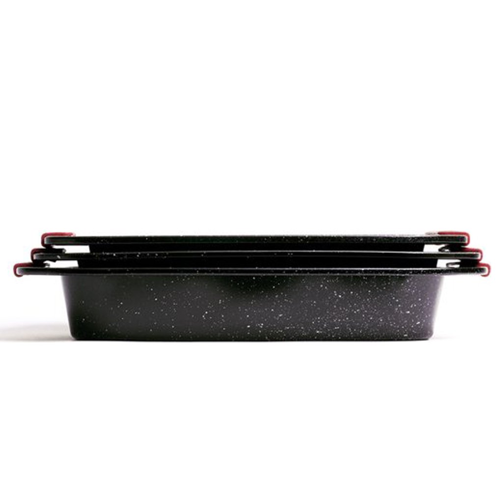 A minőségi, tartós sütőformák minden konyha alapvető kellékei közé tartoznak. Az egészséges sütéshez minimális zsiradékkal kínálunk Önnek egy 3 darabos Royalty sütőforma készletet antibakteriális, tapadásmentes márvány bevonattal. A fogantyúk szilikon markolattal és speciális Soft touch felülettel rendelkeznek a kellemes, égetés nélküli fogás érdekében. A készlet három méretű sütőformát tartalmaz.