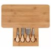 Bambusz vágódeszka készlet sajtkiegészítőkkel - 5 darab. Ideális ajándék a sajtok szerelmeseinek. A praktikus fióknak köszönhetően az eszközök a deszka belsejében tárolhatók.
