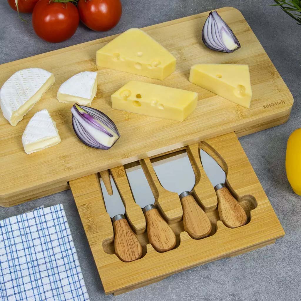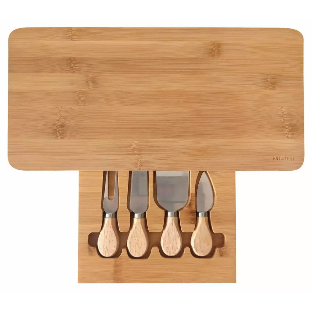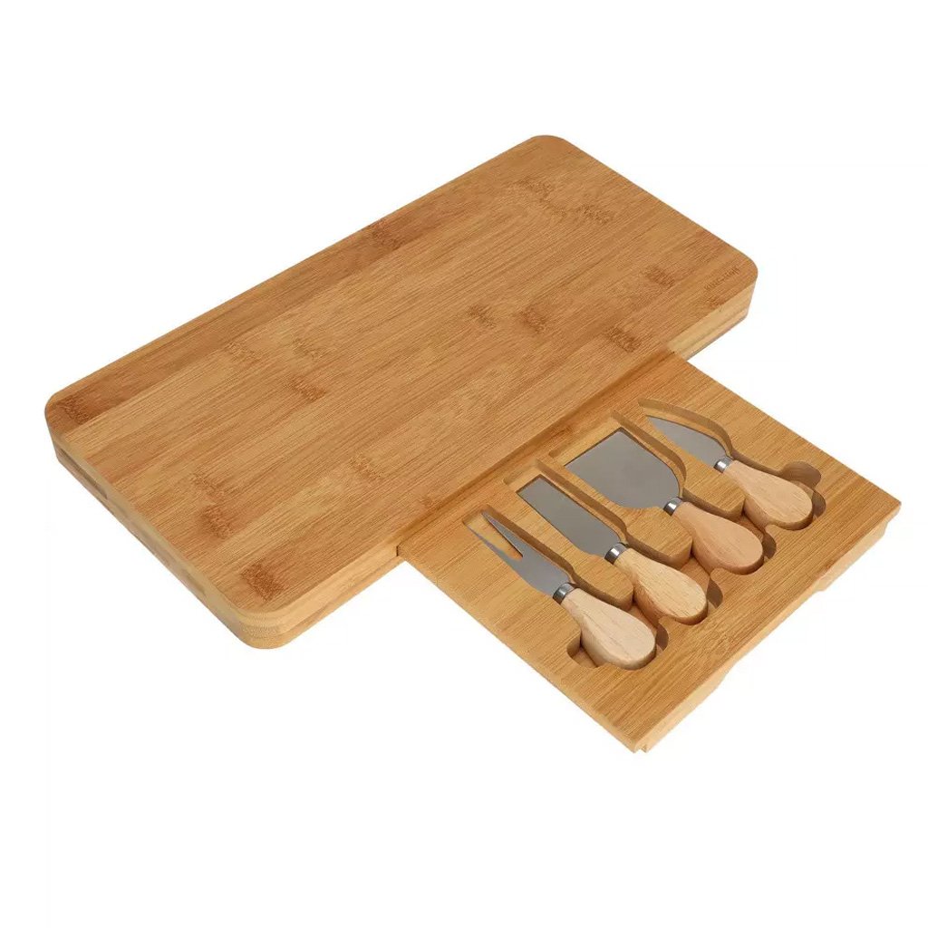 Bambusz vágódeszka készlet sajtkiegészítőkkel - 5 darab. Ideális ajándék a sajtok szerelmeseinek. A praktikus fióknak köszönhetően az eszközök a deszka belsejében tárolhatók.