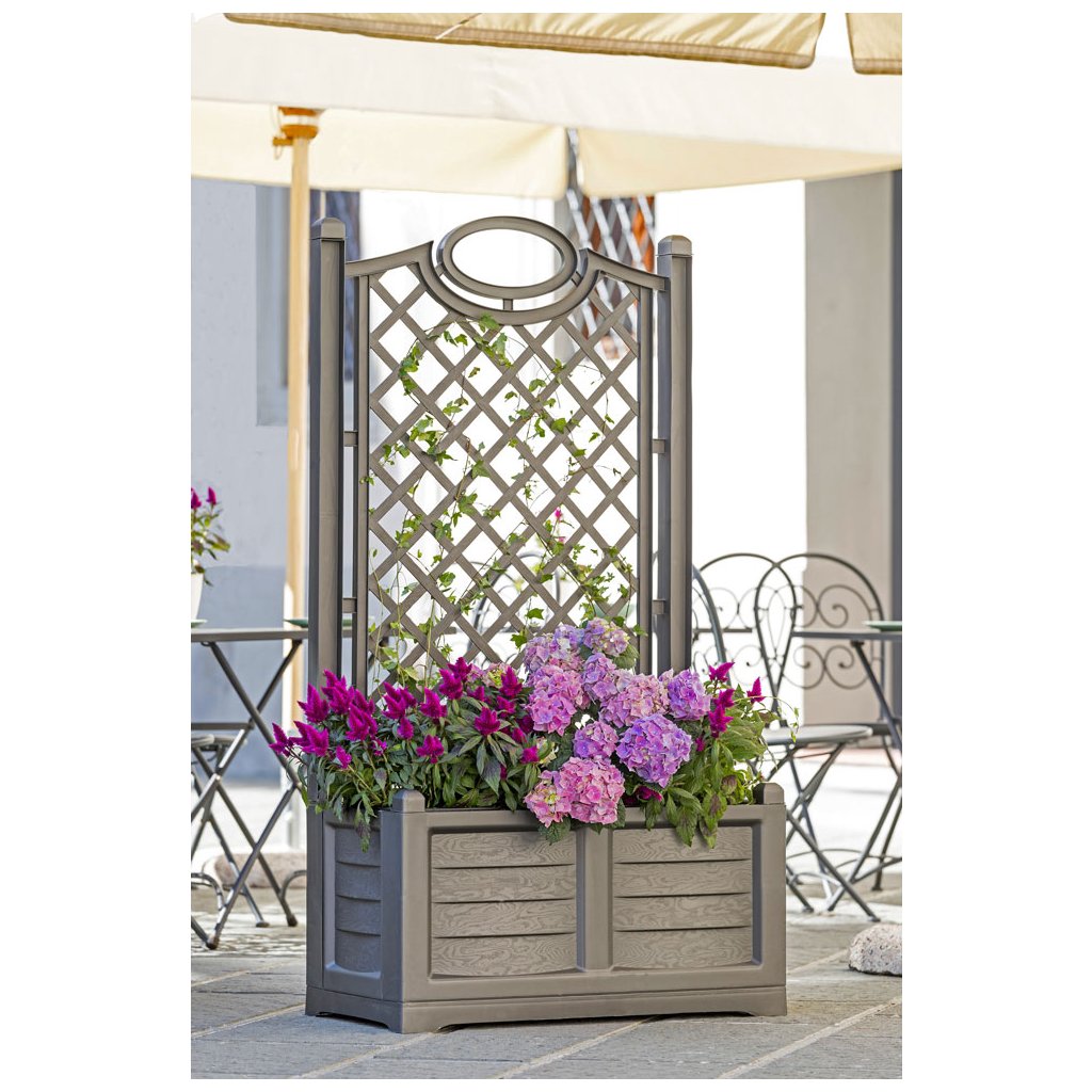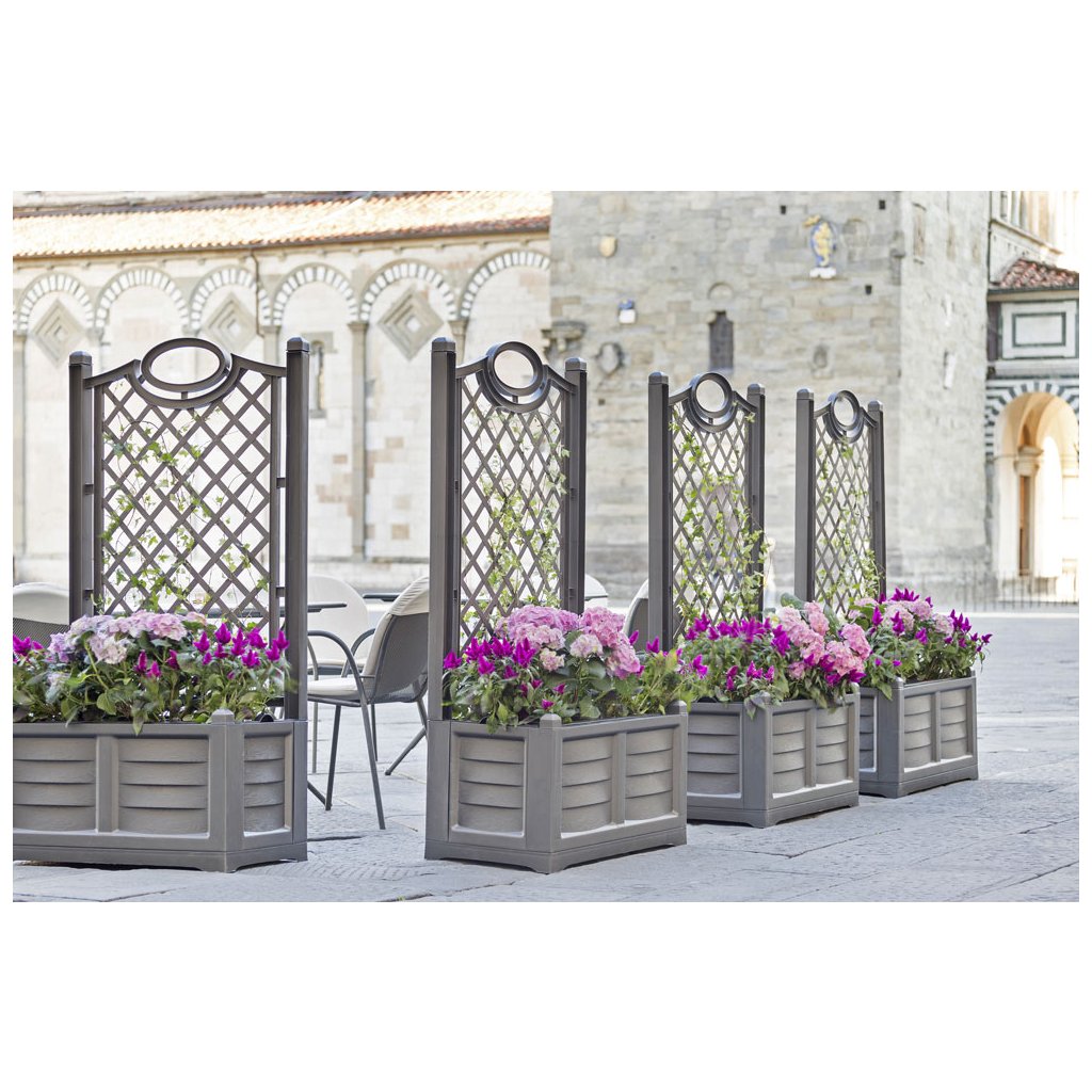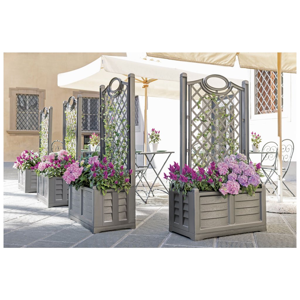 A nagyméretű SEPARE AT virágláda díszes támasztórácsával virágok vagy fák számára elegáns és természetes elválasztóelemként szolgál két tér között, díszíti a teraszt, vagy új, romantikus zugot hoz létre a kertben, olasz stílusban. Olasz gyártó gyártja, a fa. BAMA.