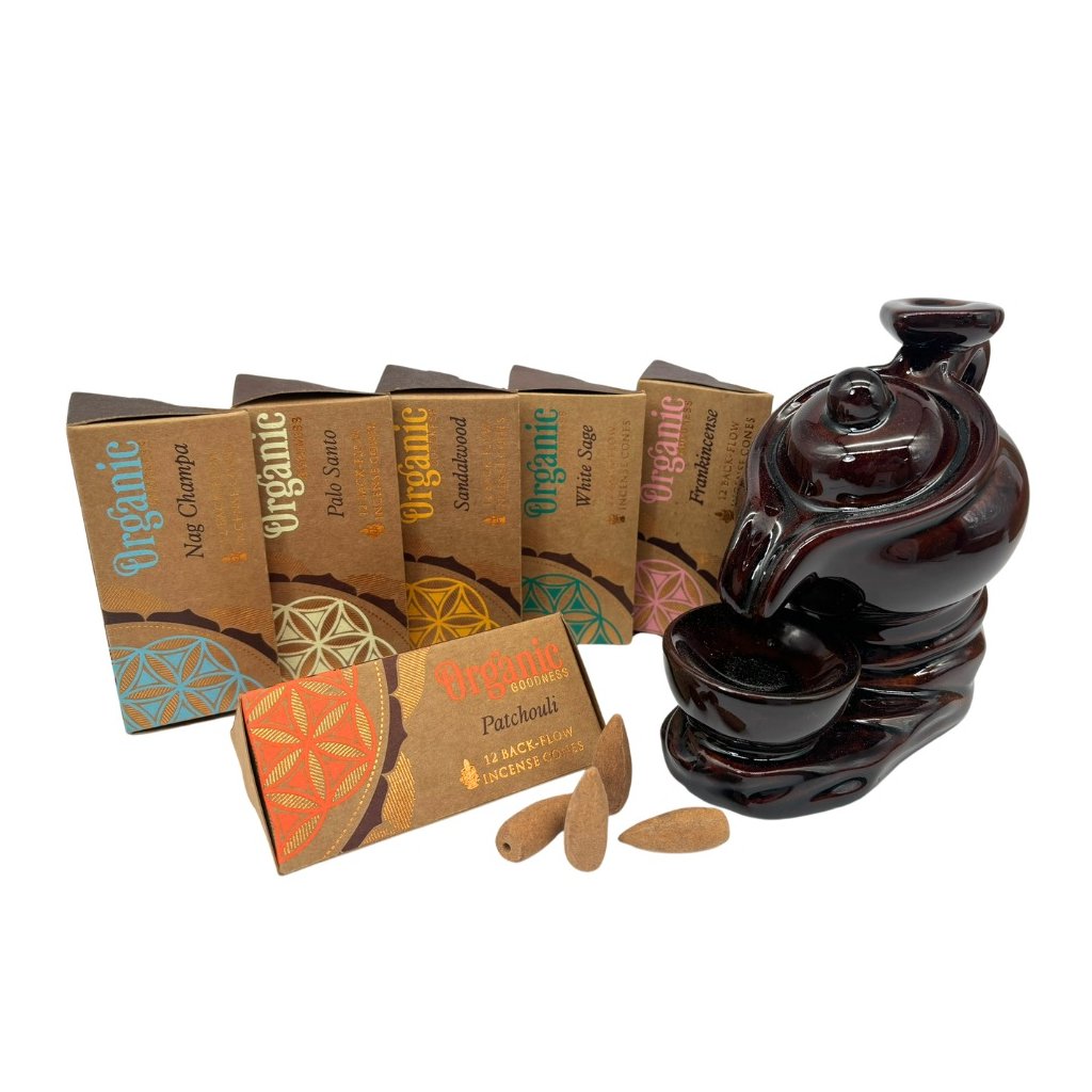 Kedvező árú, 6 darabos illatkúp készlet az Organic Goodness termékcsaládból, beleértve az eredetieredeti füstölőkúp-tartó teáskanna és csésze formájában.