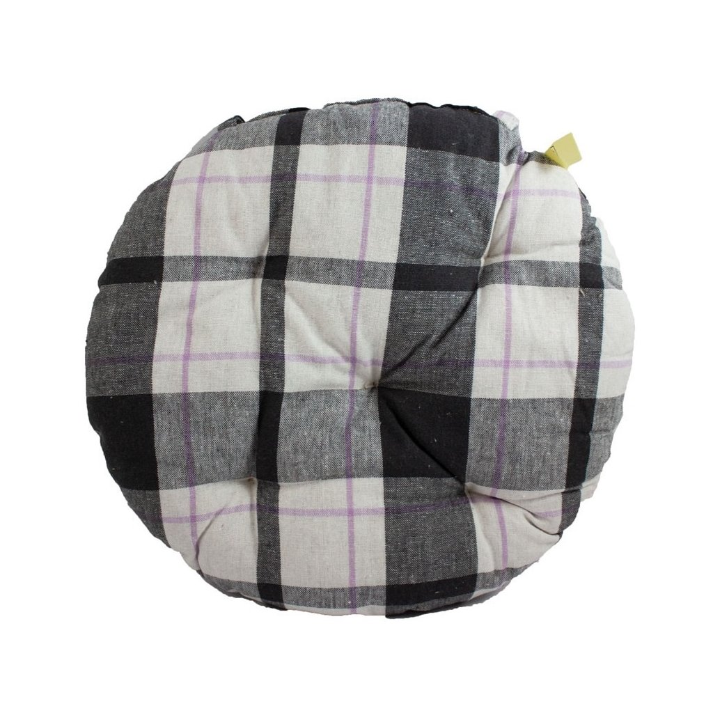 Nem szokványos, kerek, steppelt, 5 cm magas ülőpárna szürke-fehér kockás mintával.