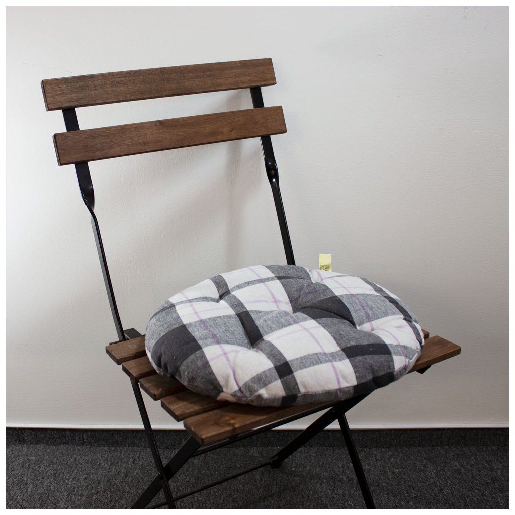 Nem szokványos, kerek, steppelt, 5 cm magas ülőpárna szürke-fehér kockás mintával.