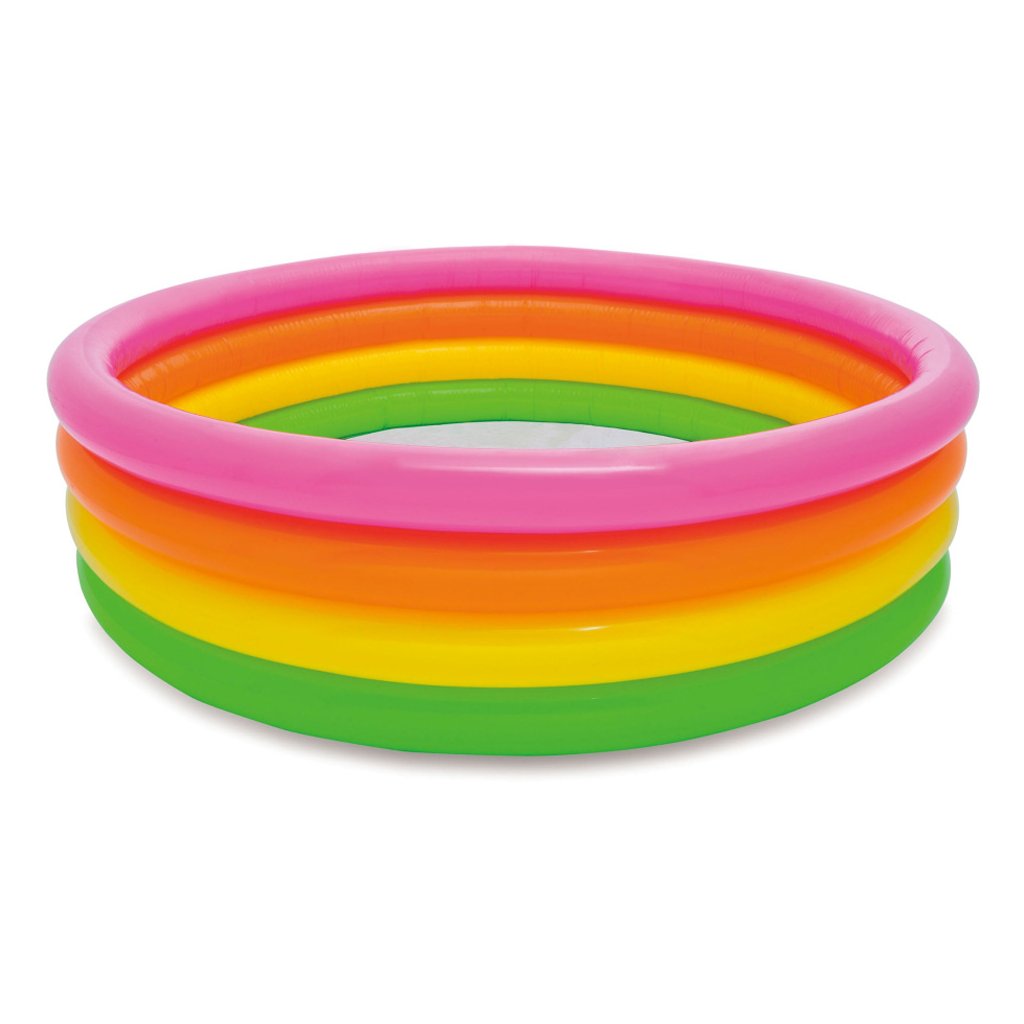 A színes szivárványszínű, 4 felfújható színes gyűrűvel ellátott felfújható gyermekmedence megfelelő stabilitást és védelmet nyújt a gyermekek szórakozásához. Puha alj, leeresztő szelep, javítófoltok a csomag részét képezik.
