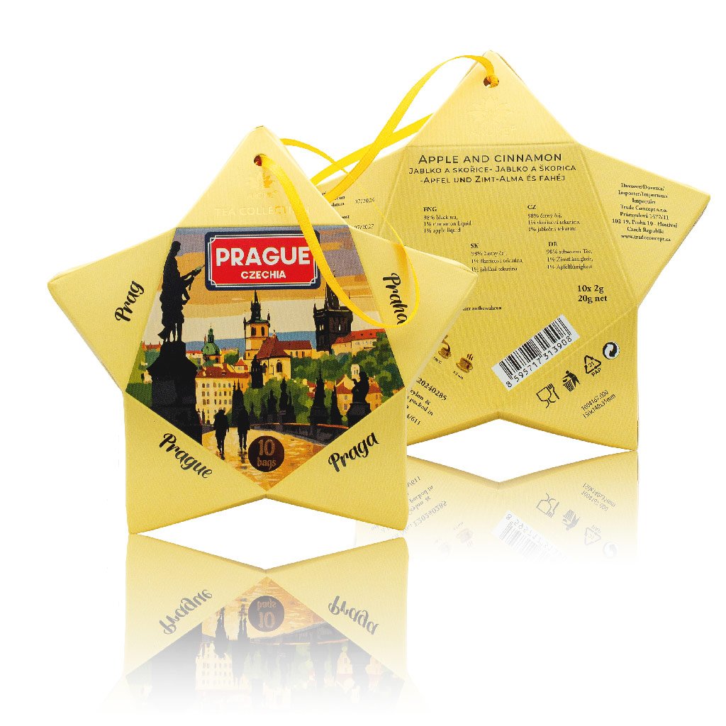 10 darab Srí Lanka-i fekete tea tasak alma és fahéj ízesítéssel csillag alakú díszdobozba van csomagolva, melyet gyönyörű képek díszítenek a történelmi Prágáról.