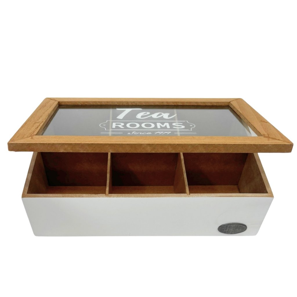 Teafilter tartó doboz hat rekesszel és fa fedéllel, üvegablakkal, mméret 24 x 16 x 7 cm, fehér színű.