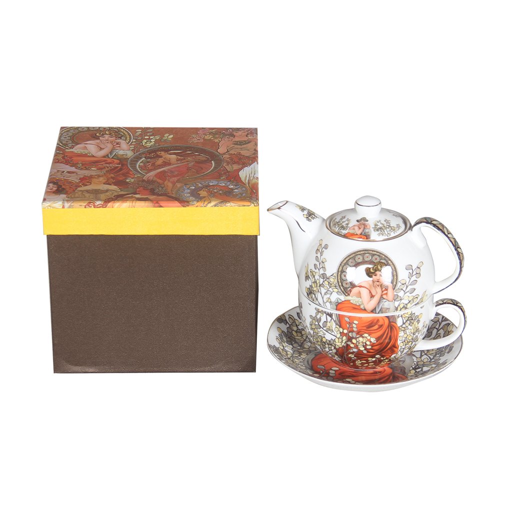 Exkluzív porcelán teáskészlet egy személy részére, más néven Tea for one, tökéletes a pihenés pillanataihoz. A gyönyörű, Alfons Mucha által készített dekorációnak köszönhetően is igazán élvezni fogja a teát a készletből. Az egy személyes teáskészlet tartalmaz egy teáskannát, egy bögrét, egy csészealjat és egy fedőt. Minden gyönyörűen illeszkedik egymáshoz, így a forró ital kezelése is valamivel biztonságosabb.