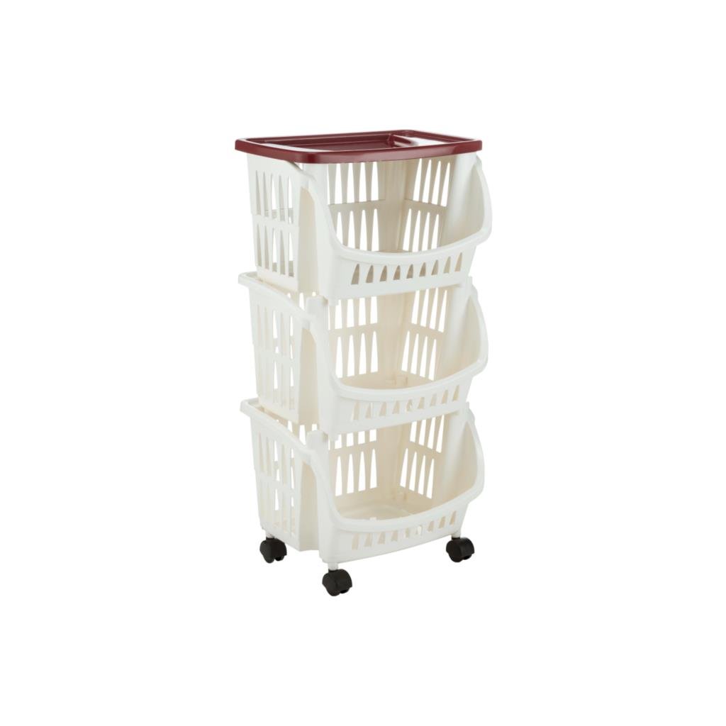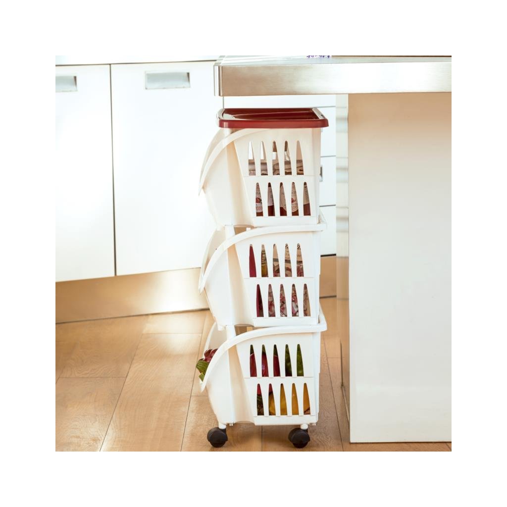 A gurulós polc 3 kosárból és 1 tálcából áll, a kosarak zárakkal vannak egymáshoz rögzítve. A három rekesz áttekinthető és könnyen hozzáférhető tárolóhelyként szolgálhat. Vagy előkészítheti bennük az összes szükséges dolgot, a főzéshez szükséges alapanyagokat, gyümölcsöket, apró frissítőket, és a polcot könnyen áthelyezheti oda, ahová éppen szüksége van. Műanyag forgókerekekkel van felszerelve a könnyű kezelhetőség érdekében.
