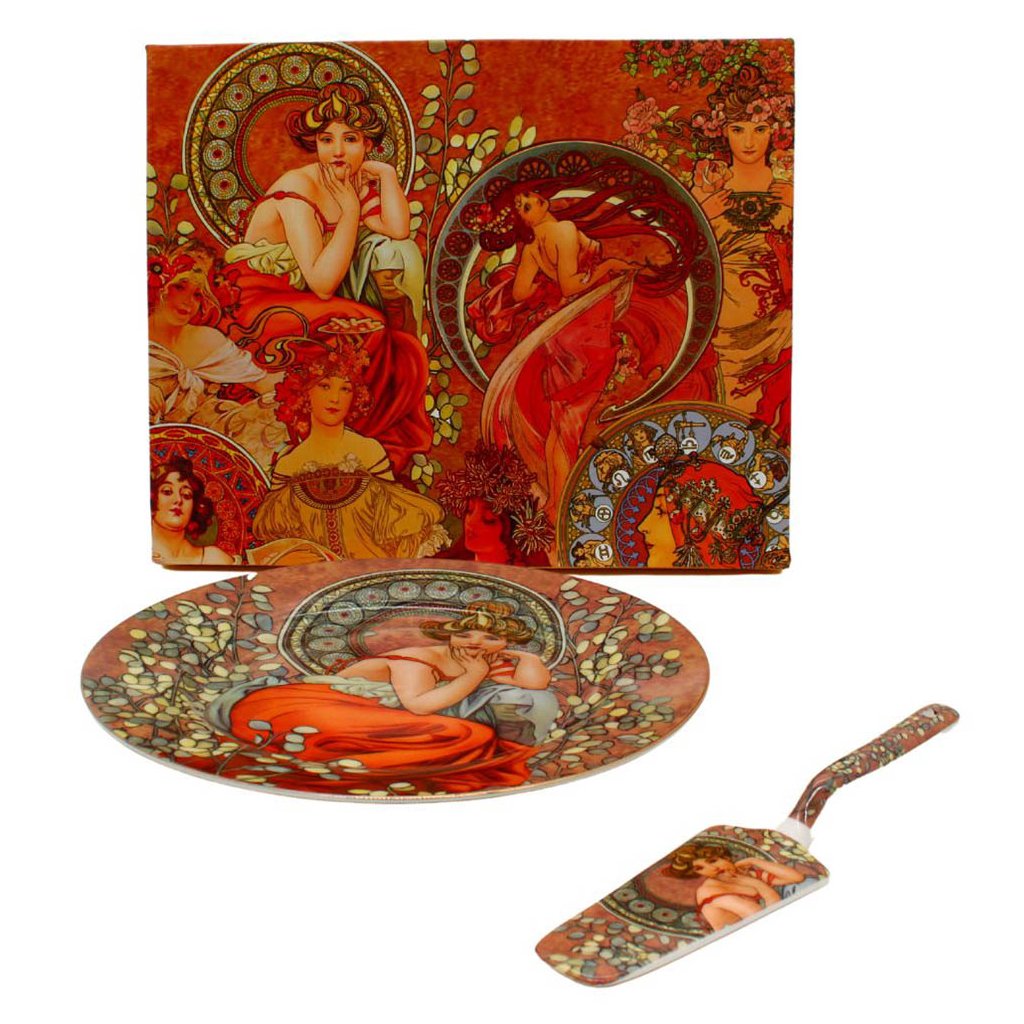Egy születésnapi ünnepség, esküvő vagy akár házassági évforduló sem múlhat el egy gyönyörű torta nélkül. Ezekre a különleges alkalmakra nem hiányozhat egy tortatál lapáttal. A stílusos, luxus tortatálon Alfons Mucha cseh festő művének dekorációjával a torta remekül mutat majd a terített asztal közepén.