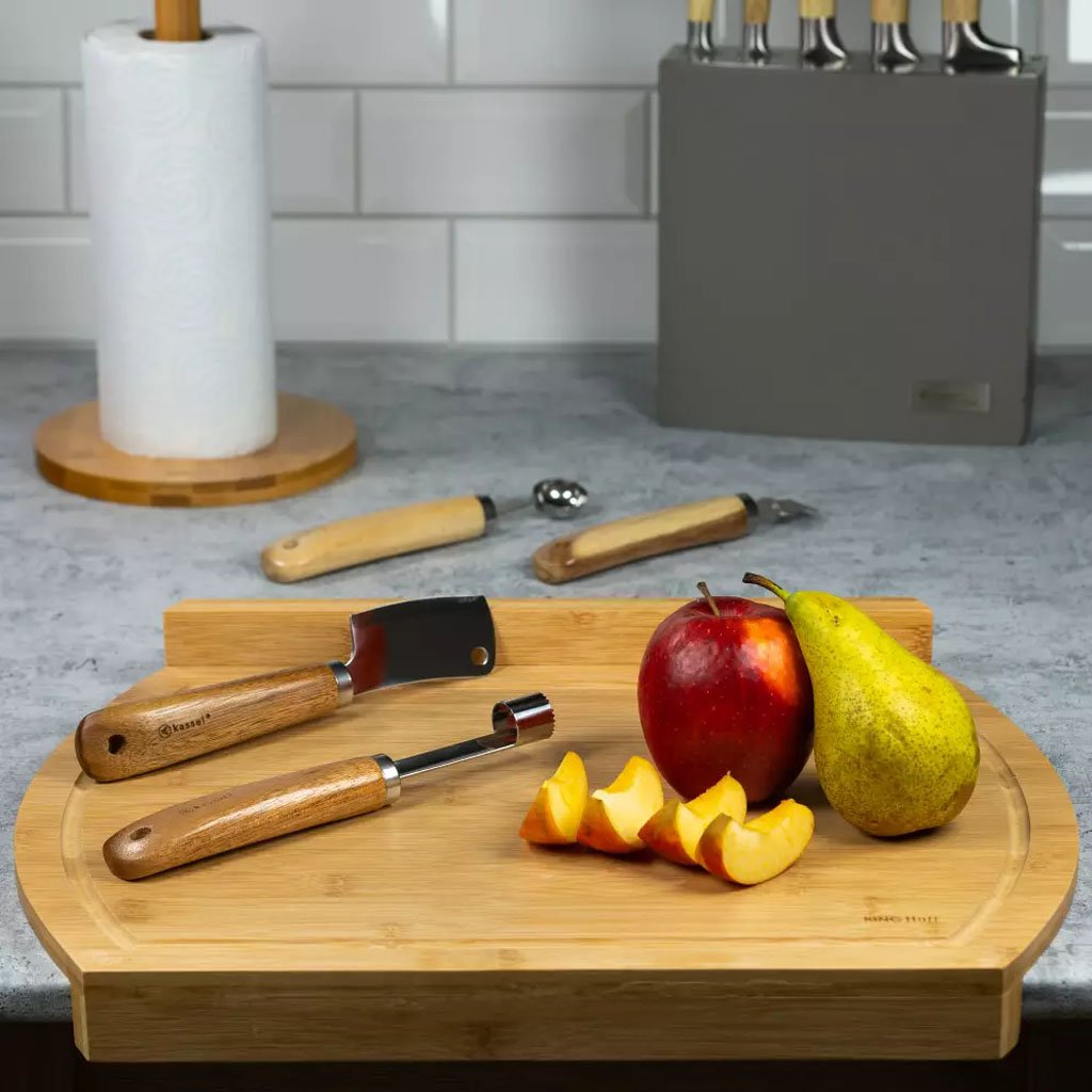 A vágódeszka mérete és a kétoldalas használat kényelmes szeletelést tesz lehetővé. Ugyanakkor meghosszabbítja a deszka élettartamát.