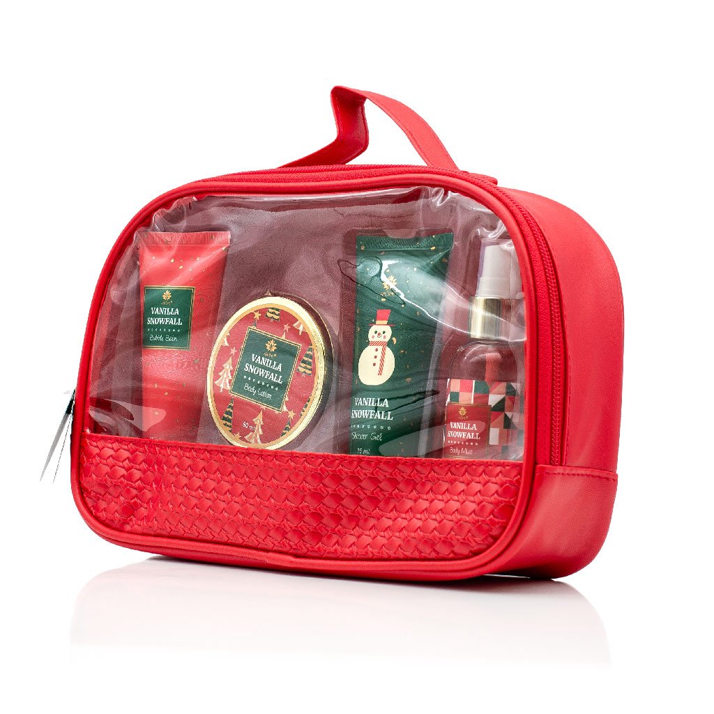 Kényeztesd az érzékeidet a ARÔME Vanilla Snowfall karácsonyi kozmetikai készlettel, amely kellemes hangulatot teremt a vanília édes illatával. Az egész szett elegánsan egy praktikus kozmetikai táskába csomagolva, és készen áll, mint gyönyörű ajándék a téli nyugalom pillanataihoz.