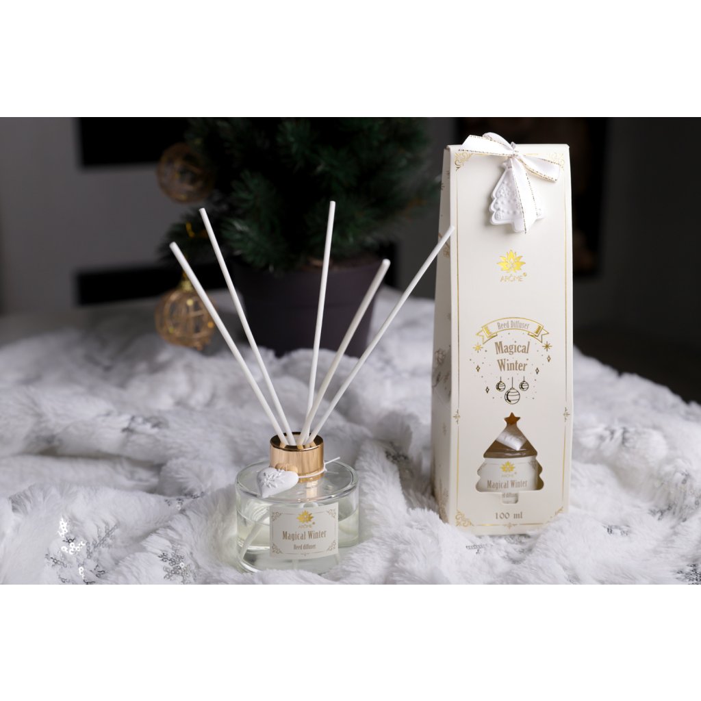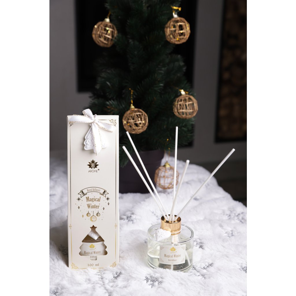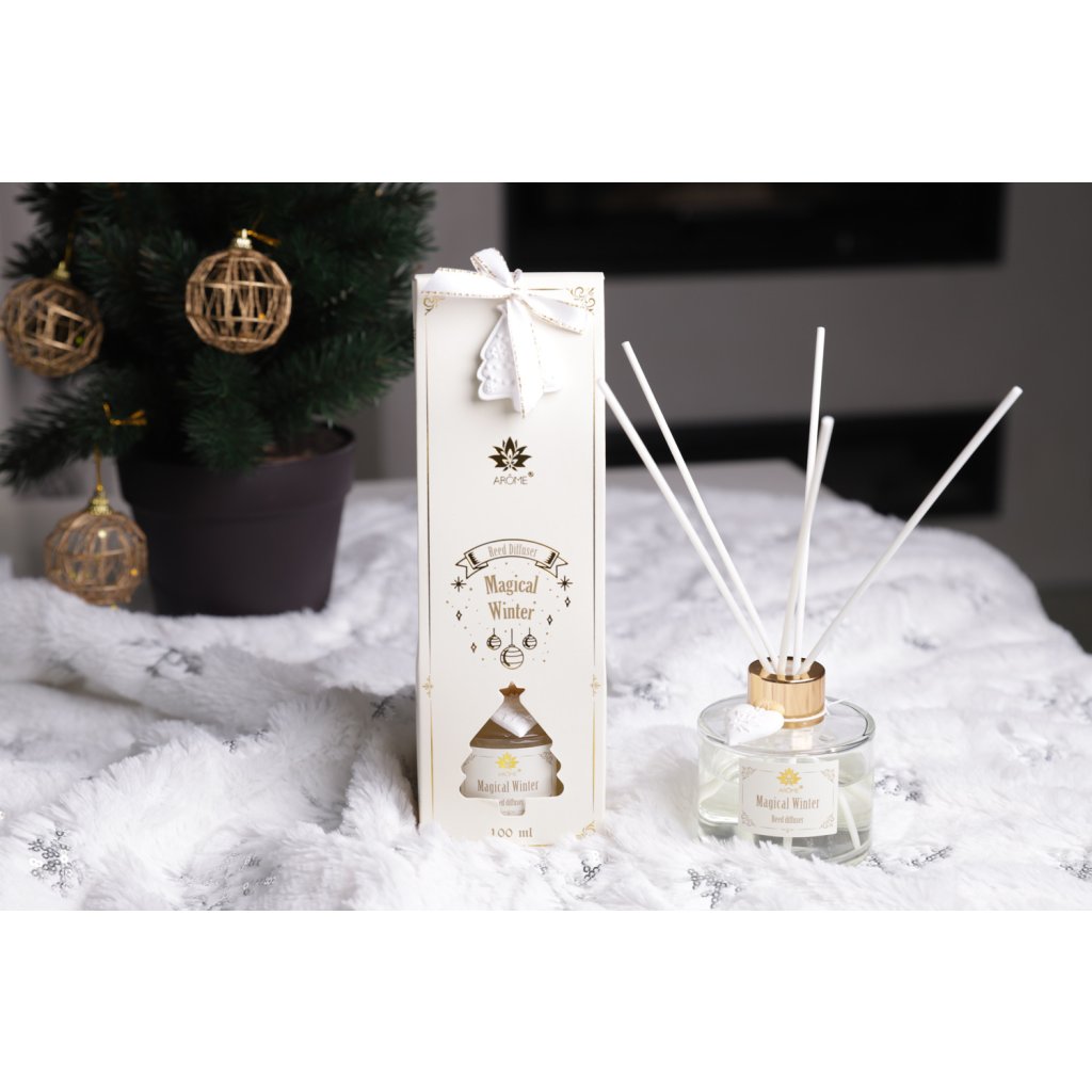 Az ARÔME diffúzor fehér és arany elegáns csomagolása nyolc pálcikával és két dekoratív illatos agyaggal a palackon és a csomagoláson a télre emlékeztet. A diffúzor a Magikus tél nevet viseli. Tartalom 100 ml.