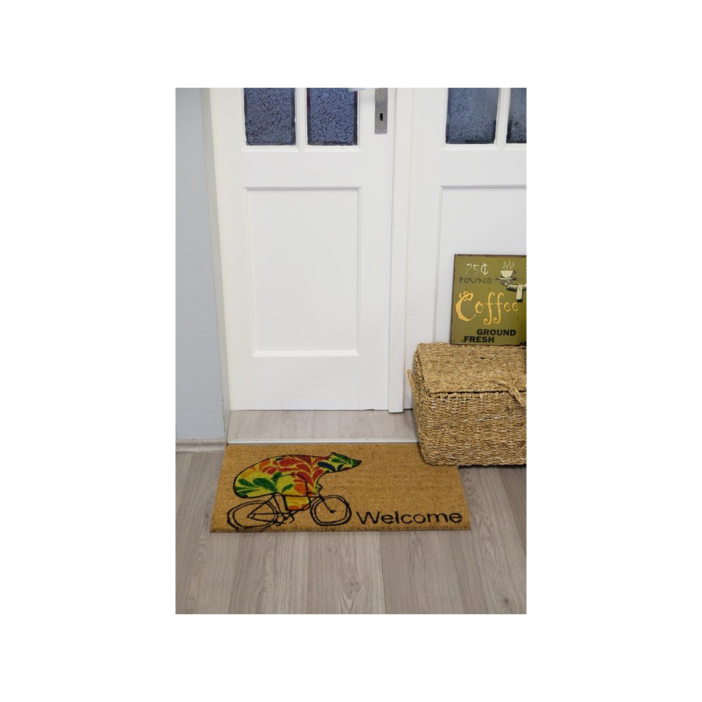 A lábtörlők néha igazán ötletesek. Például ez a bicikliző medvés. Még egy ilyen kiegészítő is sokat elárul rólad. Az alsó része gumírozott, így garantálja a padlóhoz való rögzítést. A felső rész kókuszrostból készült.