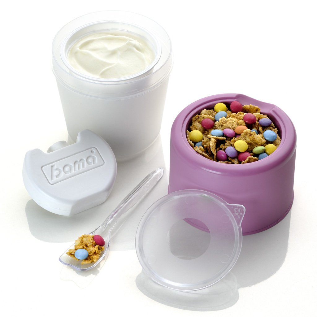 A Bama márkájú praktikus YO KIT joghurtos pohár ideális utazáshoz, munkához vagy piknikhez. Az okos, külön rekesszel ellátott fedélnek köszönhetően könnyedén magával viheti a müzlit, gyümölcsöt vagy más hozzávalókat, és közvetlenül fogyasztás előtt adhatja a joghurthoz.