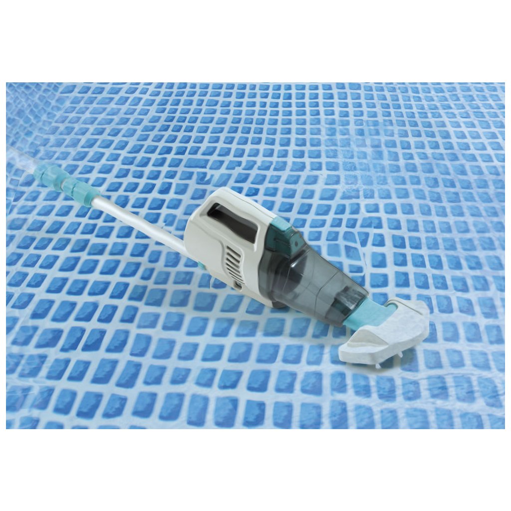 Az INTEX akkumulátoros porszívó az föld feletti és süllyesztett medencék, pezsgőfürdők és gyermekpancsolók karbantartására szolgál.biztosítja a tisztítást anélkül, hogy a szűrőrendszerhez kellene csatlakoztatni. A könnyű, akár 280 cm hosszú teleszkópos rúdnak és a két cserélhető szívófejnek köszönhetően könnyen elér minden sarkot, és megszabadítja medencéjét a durva szennyeződésektől, valamint a finom üledéktől és algáktól.
